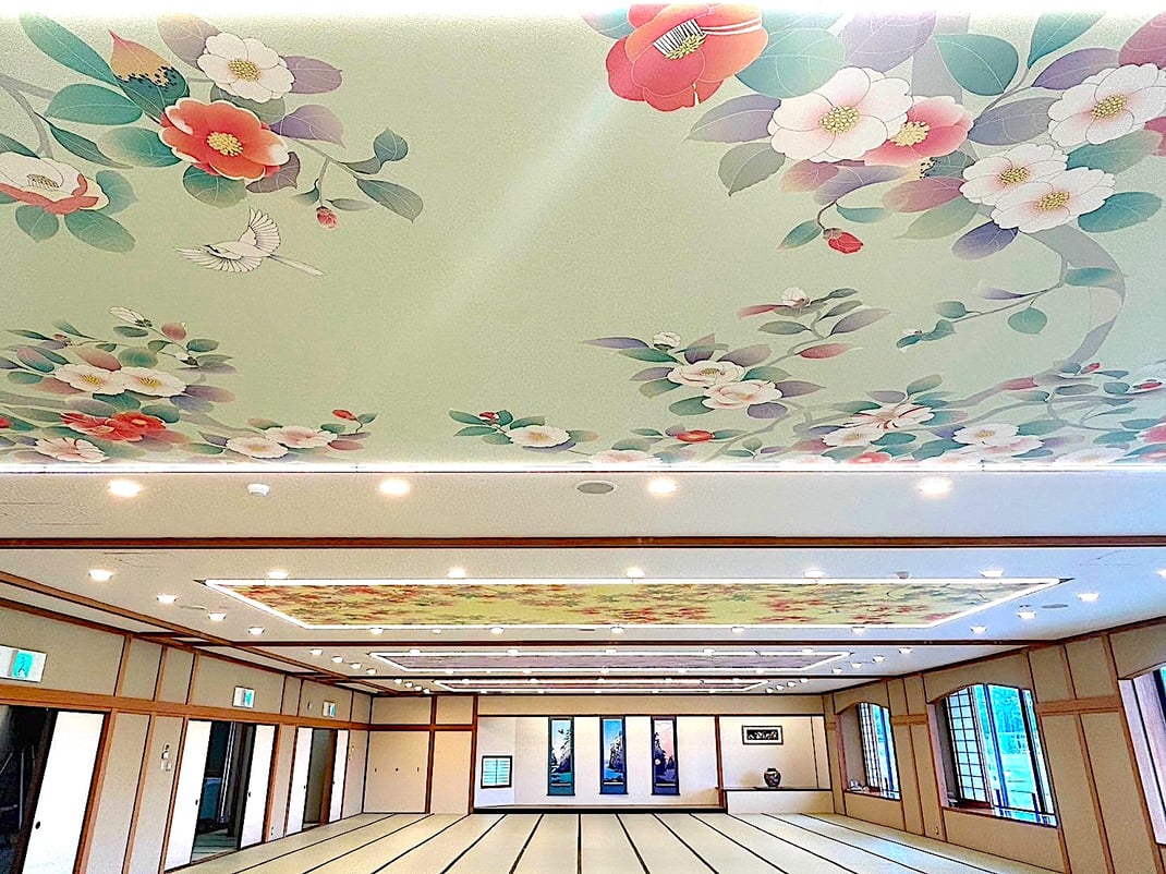 Large hall / Ceiling painting “Yuzen Flowers of the Four Seasons”, hanging scroll “Reiwa Nishiki-e Shiga Sankei”, panel “Shiga Town Flowers, Hamanasu”